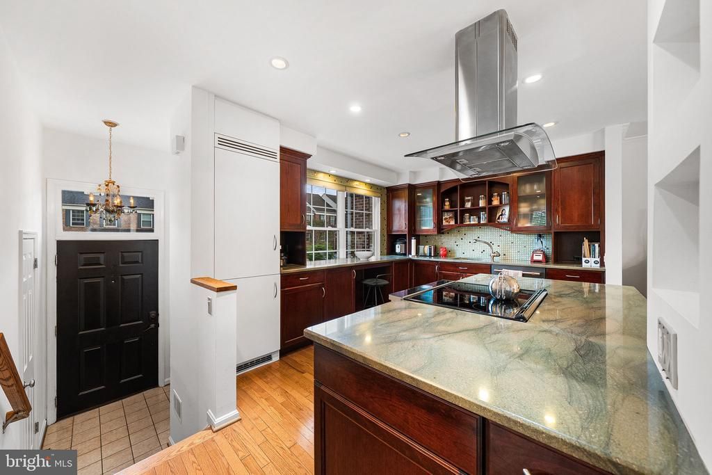 Beautifully remodeled end unit townhome offering four bedrooms, three full baths, and one half bath in a fantastic location. A welcoming and spacious entry greets you with a convenient powder room. The kitchen has been thoughtfully opened to flow seamlessly into the dining room and features modern updates including gorgeous granite countertops, custom cabinetry, a custom tile backsplash, abundant counter space, and an eye catching hood over the electric range. A large island provides additional seating and makes this space perfect for both everyday living and entertaining. The main level showcases stunning hardwood floors and a bright living room with high ceilings and a charming corner wood burning fireplace. As an end unit, this home is filled with natural light from extra windows. Step outside from the living room onto the Trex deck, complete with a convenient spiral staircase leading down to the fenced yard. Upstairs, the primary suite offers a peaceful retreat with a designer bathroom featuring custom shower tile, two closets, and a large picture window with beautiful views. Two additional bedrooms with carpet and a full hall bath with a tub shower combination complete the upper level. The expansive walkout lower level provides incredible versatility with a cozy family room featuring a brick wood burning fireplace and a sliding glass door that opens directly to the patio and fenced yard, creating seamless indoor outdoor living. This level features new carpet on the stairs, hallway and bedroom along with a convenient kitchenette that includes ample cabinetry, sink, refrigerator, and microwave, along with a fourth bedroom and full bath. There is also plenty of storage throughout the home. The entire home has been freshly painted, enhancing its bright and move in ready appeal. Key system updates include HVAC replaced in 2020 and a new roof in 2023. Ideally located just minutes from major commuter routes including 495, 66, and Route 7, and close to shopping, dining, and everyday conveniences including Trader Joe's and Tysons Corner.